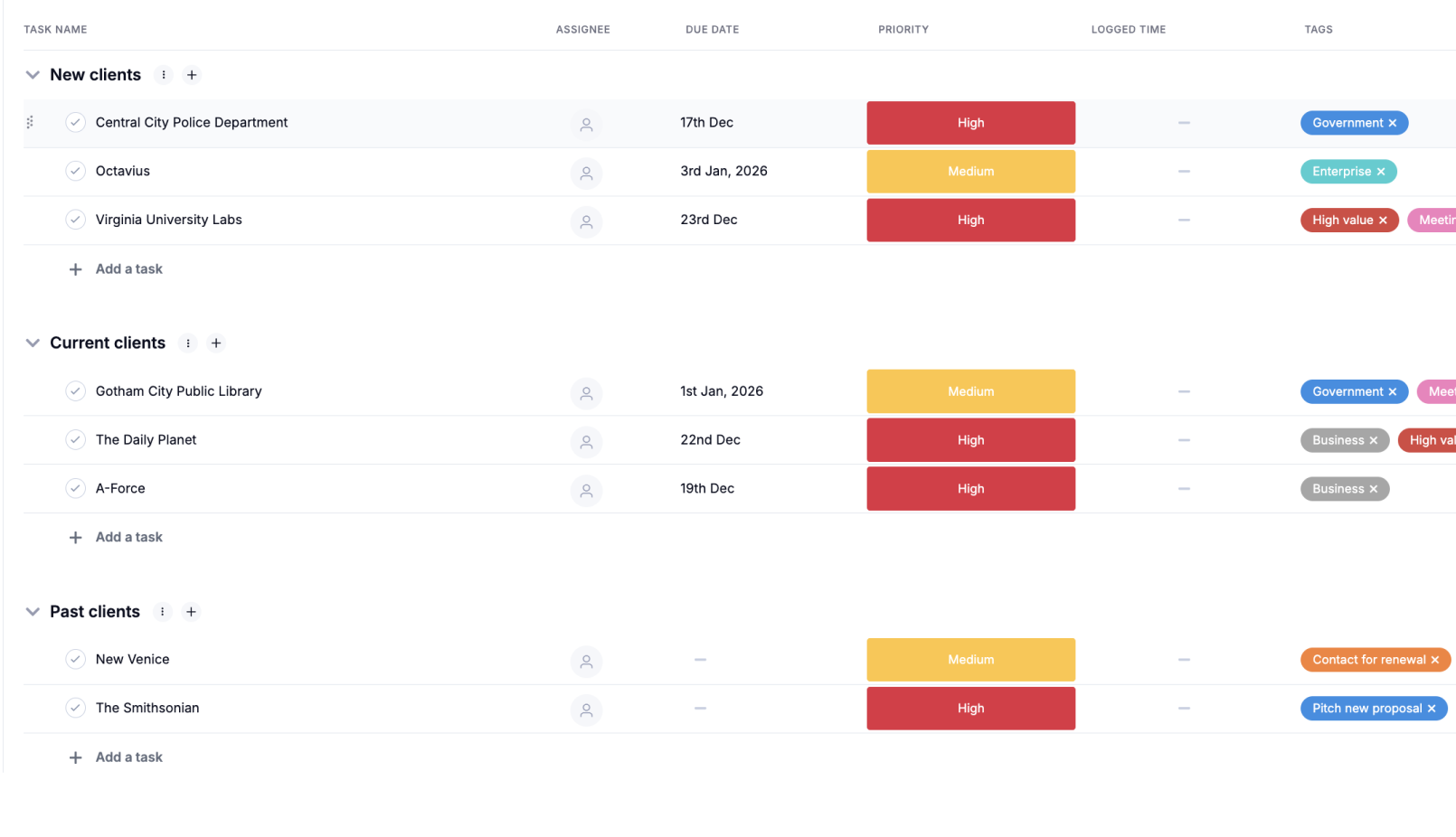 Every meeting or call becomes a task that holds notes and agreed actions, with owners and due dates. That history helps you arrive prepared for each conversation and reduces the risk of missed commitments that damage trust.
