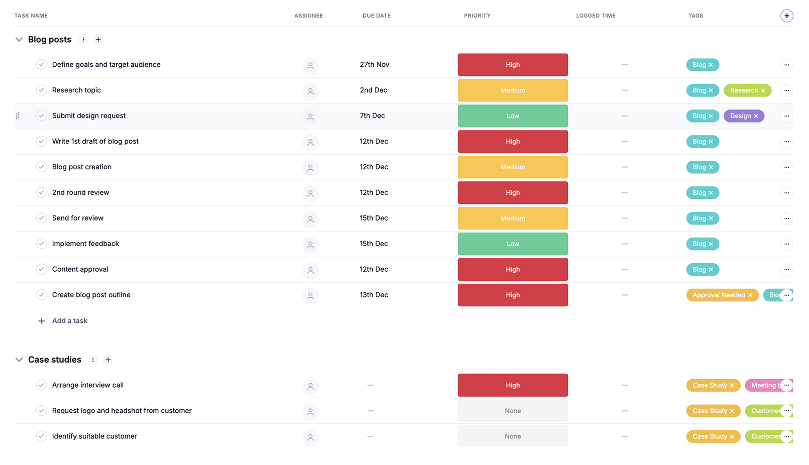 You group tasks by workflow stage and use list or board views to see where work is moving and where it is stuck. This gives you a consistent way to manage blog posts, landing pages, video scripts, and social content in the same structure.