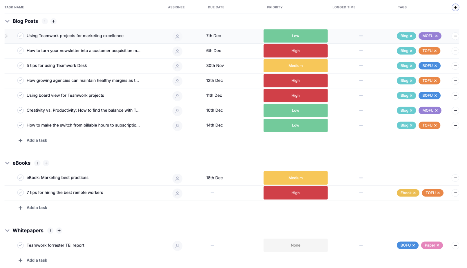 The content marketing plan template includes a structured project where you outline goals, audiences, campaigns, and the content needed to support them. It gives you ready made task lists for planning, production, and measurement so you see the full lifecycle of your content efforts.