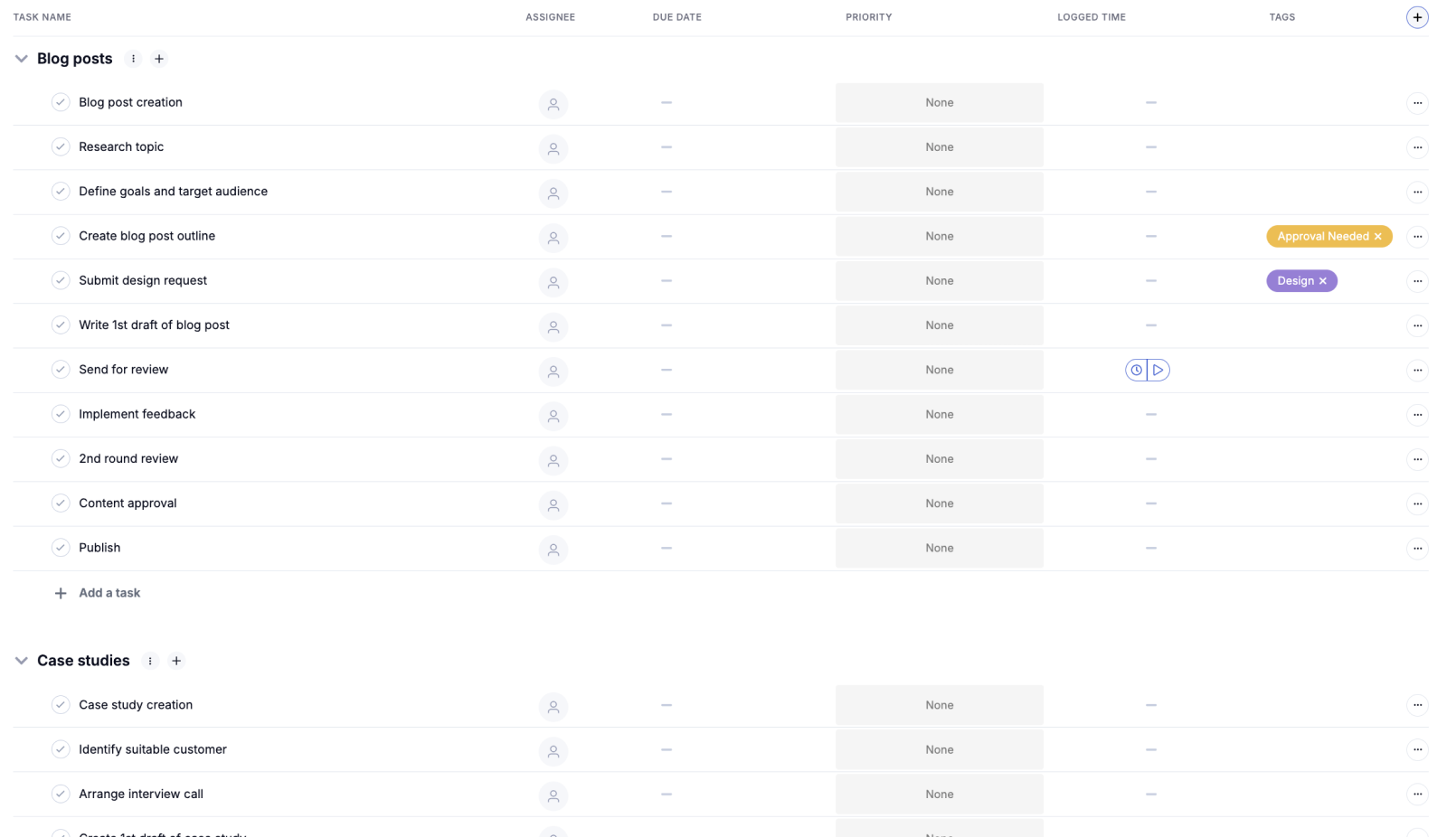 Once you decide to move ahead, you add the brief, assign an owner, and track review steps inside the same task. Comments and attachments keep feedback together, and status fields show whether an item is in drafting, under review, or ready to publish.