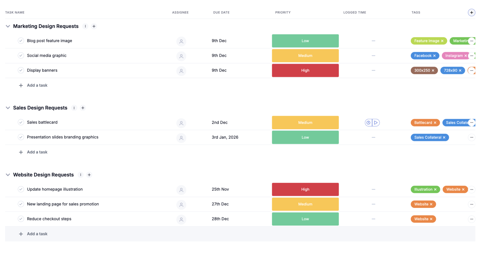 You centralise intake, define the information you need from requesters, and group work into a simple workflow from new request to final delivery. Each request becomes a task with an owner, priority, due date, and clear context, which makes planning easier and reduces back and forth questions.