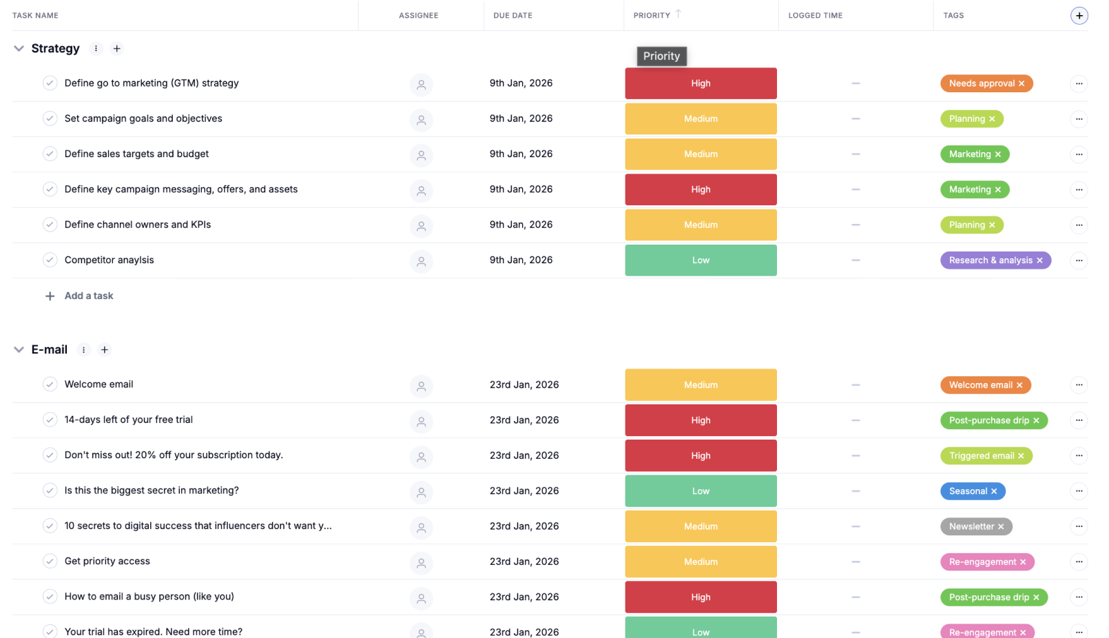 You group tasks by campaign, lifecycle stage, or audience, then capture goals, segments, and key messages in each task. This makes it easier to see how each send supports your wider email marketing strategy.