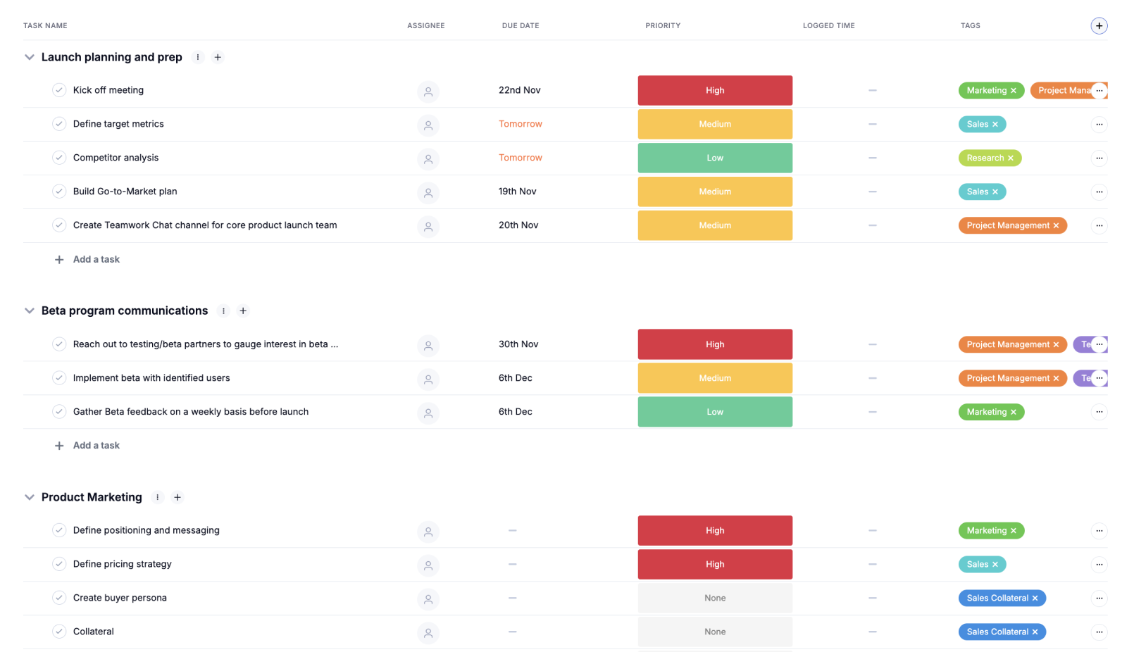 You break the launch into phases with clear milestones, such as beta, general availability, and follow up campaigns. Each task has an owner, due date, and status so teams understand what needs to happen and when.