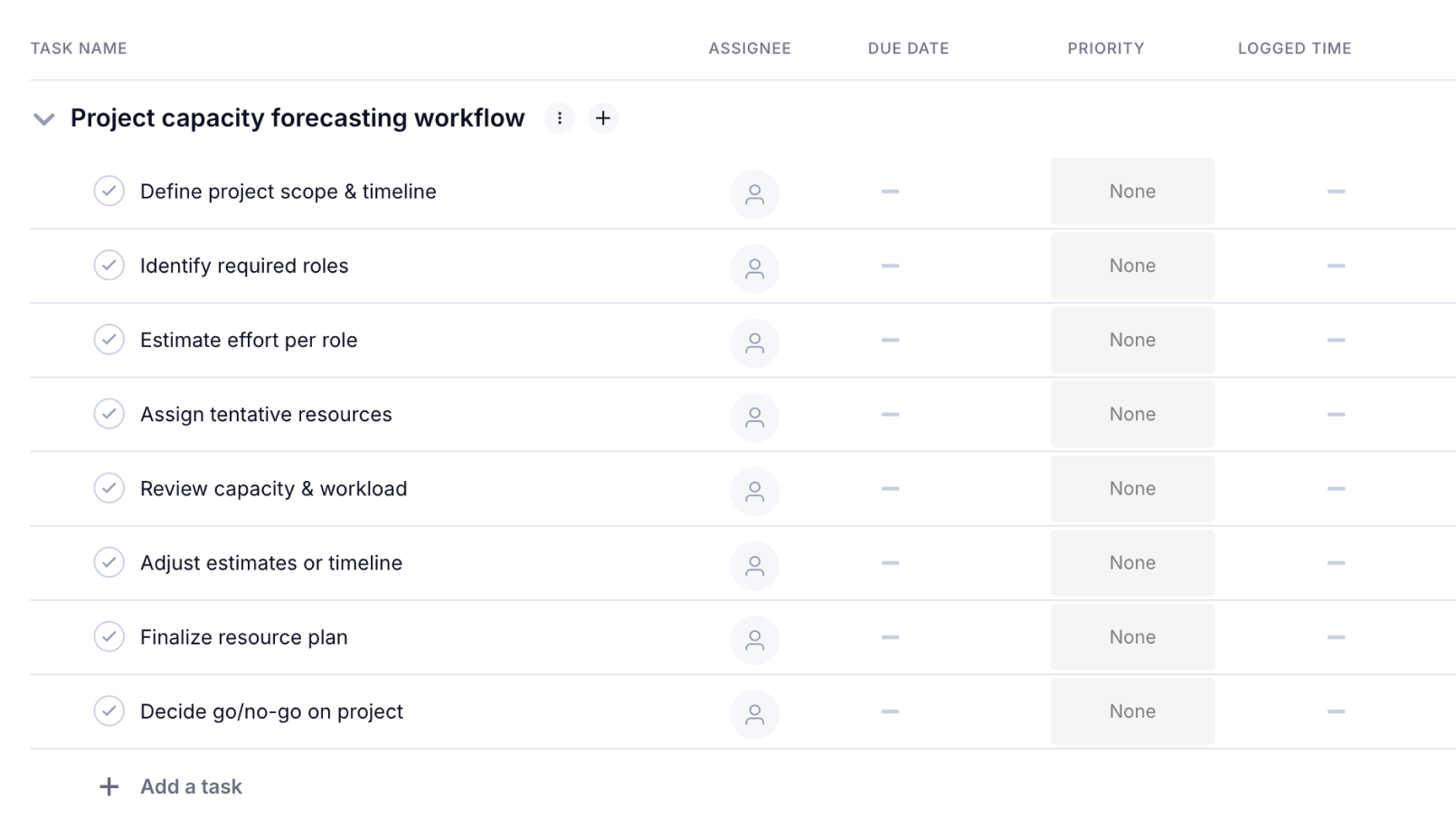 Start by creating a project from the Project Capacity Forecast Template in Teamwork. The template includes a simple structure you can adapt:
