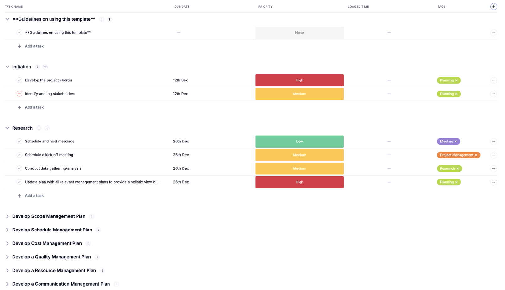 The template organises work into clear phases across the project lifecycle, with task lists, milestones, and decision points that match how professional project managers already think. Each task has an owner, due date, and status so it is easier to coordinate contributors, track dependencies, and keep delivery aligned to the agreed plan.