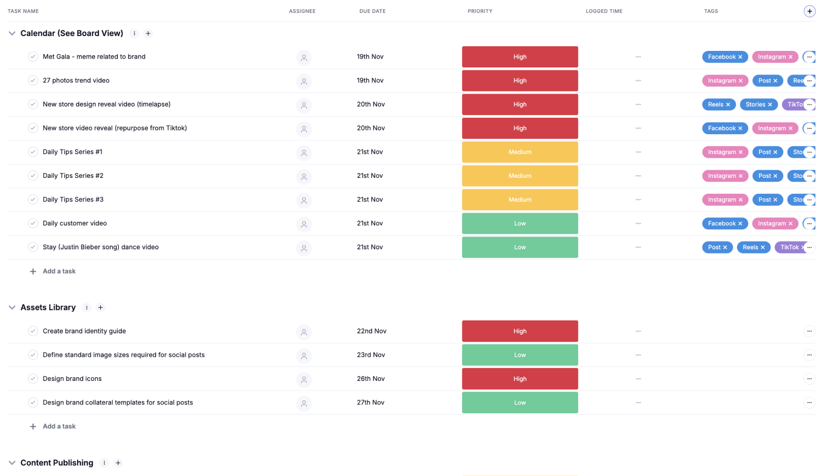 You assign posts to team members, track status from briefed through to approved, and keep final assets attached to the task. This turns your calendar into a working schedule rather than a static document, so it stays accurate as plans evolve.