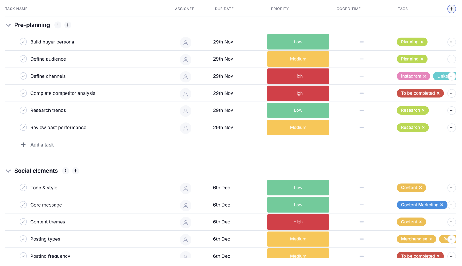 The social media plan template includes prebuilt task lists and views that mirror how you plan and run social content. Each post or content item becomes a task with an owner, due date, attachments, and status so you always know what is planned, in review, or ready to publish.