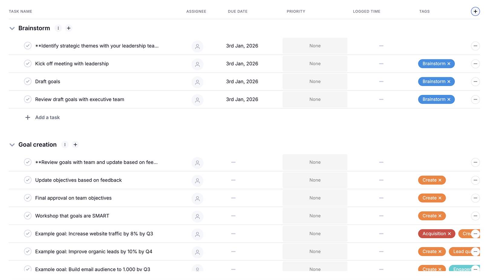 You get lists and views that help you separate strategic goals from day to day tasks while still seeing how they connect. This keeps your planning space focused on outcomes instead of turning into another generic task list.