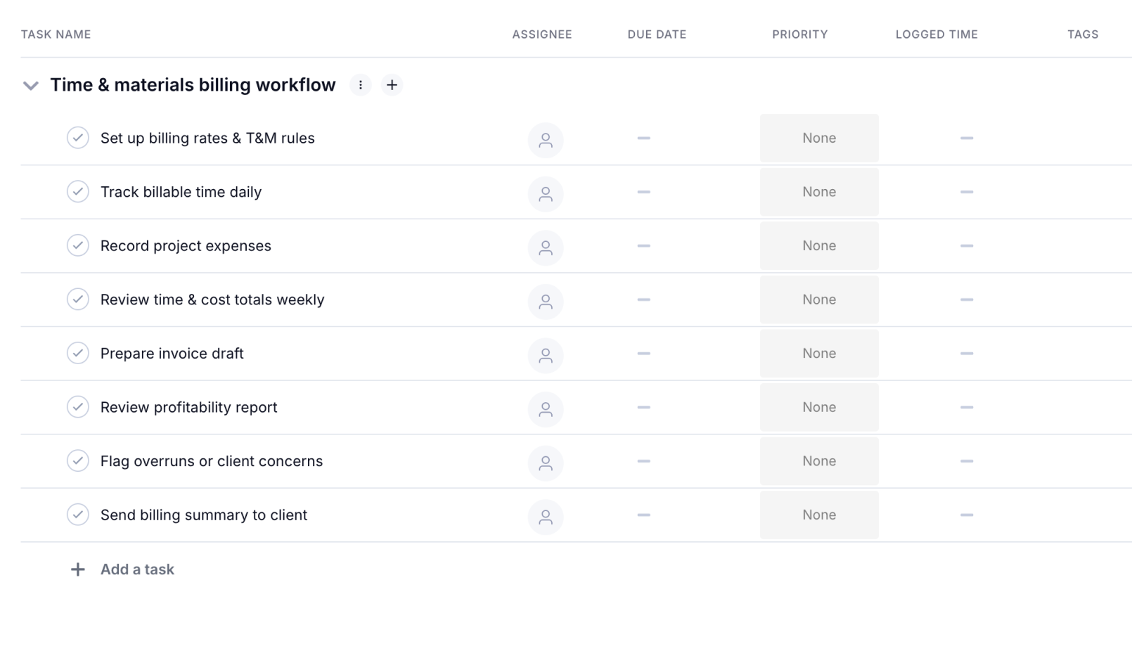 Yes. You can duplicate the Time and materials project template for each new engagement and then adjust task lists, rates, and budgets to match that client. Over time, you build a consistent way of running T and M projects so reports and invoices look familiar across your portfolio.